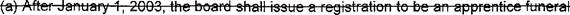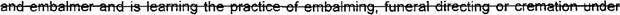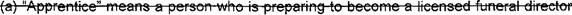 4 (a) "Apprentice" means a person who is preparing to become a funeral services licensee 5 and is learning the practice of embalmingt funeral directing, or cremation under the direct