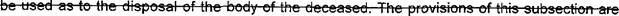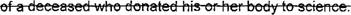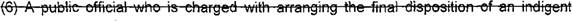 30 (2) The duties of an officer of a medical college, county medical society, anatomical 31 association, or other recognized person carrying out his or her responsibilities of dealing with 32 indigent dead human bodies who are held subject for anatomical study; or 33 (3) The customs or rites of any religious sect in the burial of its dead: Provided, That