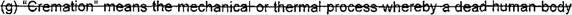 12 (e) "Cremation" means the mechanical or thermal process whereby a dead human body 13 is reduced to ashes and bone fragments and then further reduced by additional pulverization or 14 recremating when necessary.