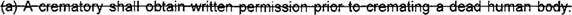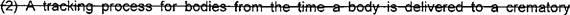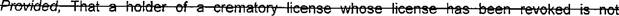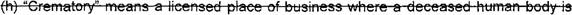 15 (f) "Crematory" means a licensed place of business where a deceased human body is 16 reduced to ashes and bone fragments and includes a crematory that stands alone or is pan of 17 or associated with a funeral establishment.
