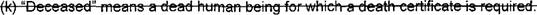 22 (i) "Deceased" means a dead human being for which a death certificate is required. 23 (i) "Embalming" means the practice of introducing chemical substances. fluids, or gases 24 used for the purpose of preservation or disinfection into the vascular system or hollow organs of 25 a dead human body by arterial or hypodermic injection for the restoration of the physical 26 appearance of a deceased.