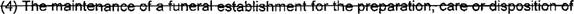 32 (3) The arranging or supervising of a funeral or memorial service for a deceased; and 33 (4) The maintenance of a funeral establishment for the preparation. care. or disposition