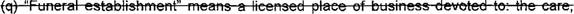 36 (n) "Funeral establishment" means a licensed place of business devoted to: The care, 37 preparation. and arrangements for the transporting. embalming. funeral. burial. or other 38 disposition of a deceased. A funeral establishment can include a licensed crematory.