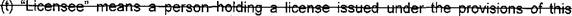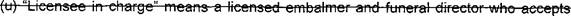 44 "Licensee" means a person holding a license issued under the provisions of this article. 45 (q)"Licensee in charge" means the holder of a funeral services license who accepts 46 responsibility for the operation of a funeral establishment.